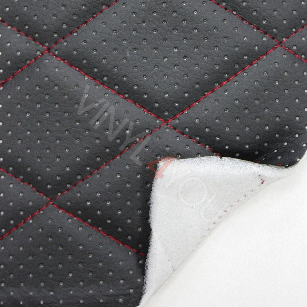 Экокожа стеганая перфорированная Ромб Черная с Красной строчкой